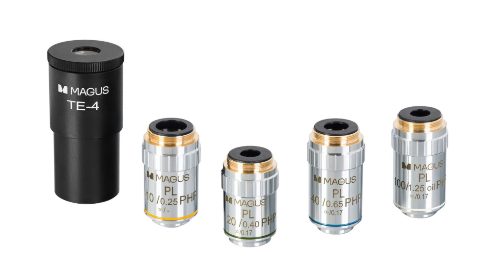 Ez a fáziskontrasztos eszköz négy fázis síkú akromatikus objektívvel rendelkezik, köztük egy 100x/1,25-ös olajimmerziós objektívvel. A 40x és 100x nagyítású objektívek rugósak az objektívek véletlen ütések elleni védelme érdekében. A készlet tartalmaz négy szűrőt is (sárga, kék, zöld, matt).