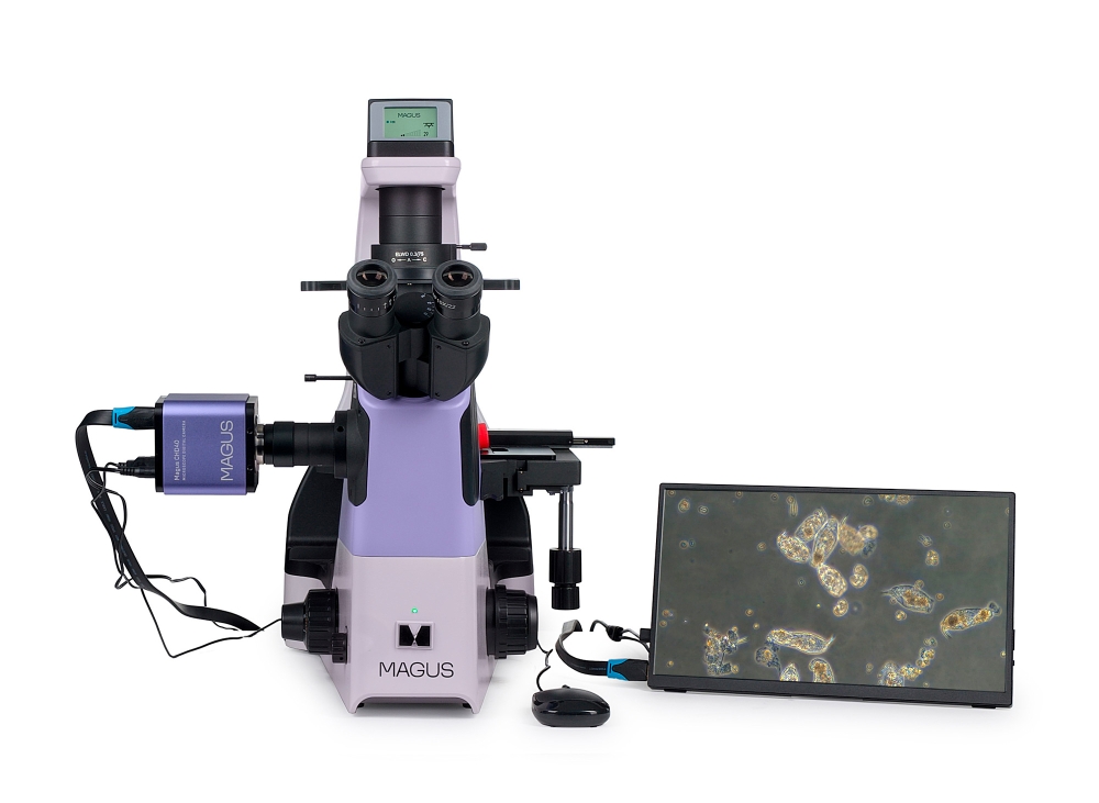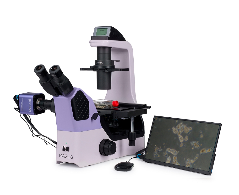 Kutatási célú mikroszkóp. A mikroszkópot kicsapódott folyadékok, sejtkolóniák, élő sejtek, szövetkultúrák, valamint egyéb festett és nem festett minták laboratóriumi üvegárukban történő tanulmányozására terveztük. A mikroszkópot a fordított kialakításának köszönhetően Petri-csészékkel, soküreges lemezekkel, fiolákkal, hengeres palackokkal és 1,2 mm fenékvastagságú, legfeljebb 75 mm- lombikokkal is lehet használni. A mikroszkóp speciális objektíveket használ az ilyen üvegedényekkel való munkához. A kondenzor eltávolításával megfigyelhetők a sejttenyészetek Petri-csészékben vagy legfeljebb 187 mm magas hengeres lombikokban. A mikroszkóp 8 MP-es kamerával és három videojel-továbbító csatlakozóval rendelkezik: HDMI, USB 3.0 és Wi-Fi. Egyszerre több eszközhöz is lehet csatlakoztatni: monitorhoz, laptophoz és asztali számítógéphez. A kamera a mikroszkóphoz a mellékelt 0,5x vagy 1x adapter segítségével csatlakoztatható. Az adapter kiválasztása a megoldandó feladatoktól függ. A 0,5x adapter növeli a látómezőt, míg az 1x adapter a képet "változatlanul" továbbítja, az élek levágásával, ugyanakkor minden részlet nagyobbnak látszik az érzékelőn. A szoftver elemzési és dokumentációs funkciókkal egészíti ki a rendszert. A digitális mikroszkópban található monitor 4K felbontású. A megfigyelések áteső fényben, világoslátóterű, fáziskontraszt és dombor-kontraszt technikák alkalmazásával lehetségesek. Opcionális komponensek lehetővé teszik a Hoffman modulációs kontraszt technikák alkalmazását is. A mikroszkóp az orvostudomány, a farmakológia, a biológia és a virológia területén zajló kutatásokra szolgál.