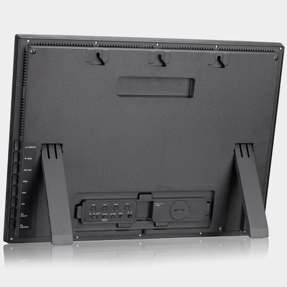 A Bresser 8 napos 4CAST XL 7 az 1-ben Wi-Fi időjárás-állomás napelemes érzékelővel modern dizájnnal és hatalmas, 48,3 cm-es (19 hüvelykes) széles látószögű színes képernyővel rendelkezik a meteorológiai adatok megjelenítéséhez. Ideális irodákba, iskolákba és faiskolákba – a bázisállomás tökéletes az időjárás áttekintésére nagy helyiségekben. A kültéri érzékelő adatainak megjelenítése mellett a Wi-Fi meteorológiai állomás az internethez is csatlakozhat, hogy megjelenítse a ProWeatherLive platform előrejelzési adatait, beleértve a 8 napos időjárás-előrejelzést a maximális/minimális hőmérséklettel és az eső eséllyel, valamint a helyi láthatósággal és felhőtakaróval.