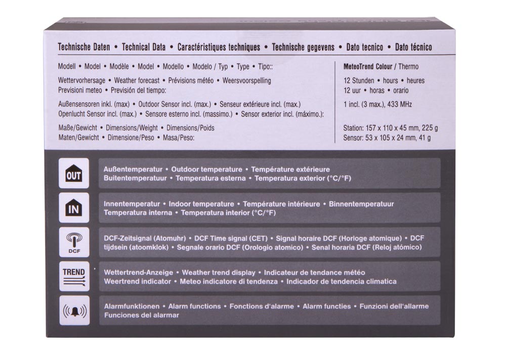 A Bresser MeteoTrend Colour RC időjárás-állomás világos színeket visz az életébe! Magas minőségű színes fóliával ellátott kijelzővel, fehér háttérvilágítással és külső érzékelővel rendelkezik. A fő állomás és a külső érzékelő jelzi a belső és külső hőmérsékletet és páratartalmat. Használjon egy 5 lépésből álló időjárás ikont az előrejelzés megtekintéséhez.