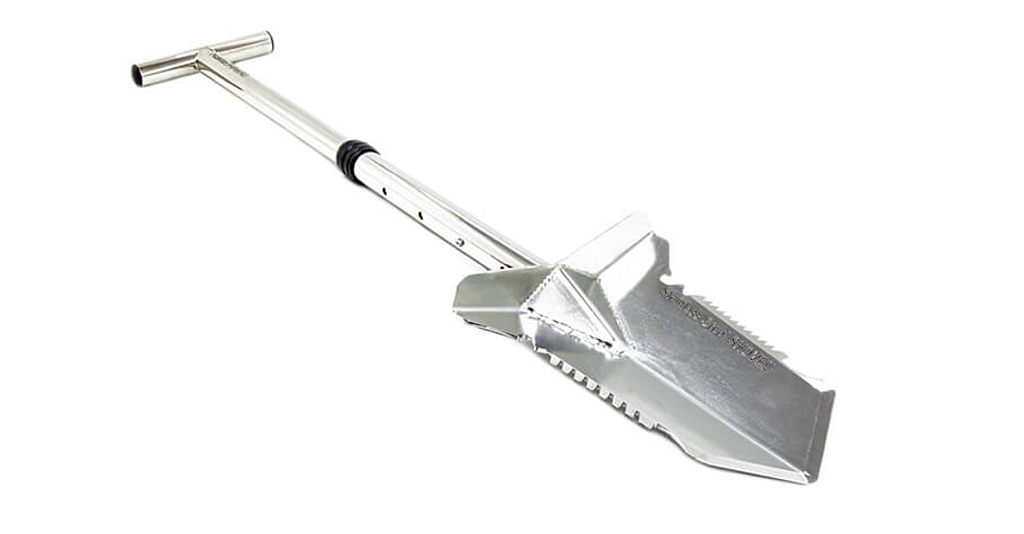 Rozsdamentes acél, négy méretre állítható hosszúságú ásó mindkét oldalán fogazott pengével .