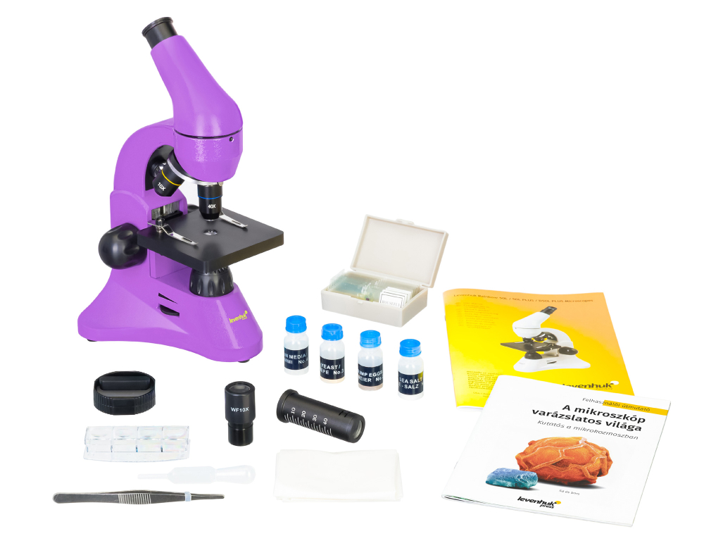 Tanulmányozhatja például a hagyma sejtjeit, láthatja, hogy a joghurt valóban élő baktériumokat tartalmaz, számos láthatatlan mikroorganizmust fedezhet fel az akvárium vízében, láthatja, hogy néznek ki a papírszálak és számos más izgalmas dolog. A Levenhuk Rainbow 50L Amethyst / Ametiszt mikroszkóp kitűnik a szokványos biológiai modellek közül – a fényes ametiszt színnek köszönhetően a megfigyelések még szórakoztatóbbak. Mindezek miatt a mikroszkóp kiváló ajándék lelkes kezdők számára.A Levenhuk Rainbow 50L mikroszkóp egy tökéletes műszer ahhoz, hogy megismerkedjen a mikrovilág rejtélyeivel. A rendelkezésre álló nagyítási lehetőségek számos különböző minta tanulmányozását teszik lehetővé.
