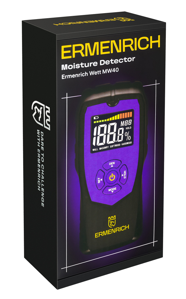 Az Ermenrich Wett MW40 egy olyan nedvességérzékelő (nedvességmérő), amely tű nélküli, vagyis a mérés során nem károsítja a mért anyag felületét. Az eszköz fából, gipszkartonból, betonból stb. készült anyagokon működik. Tökéletes mindennapi használatra, lakásban vagy vidéki házban zajló javítási munkálatokra, valamint az építőiparban és a gyártásban, amennyiben meg kell mérni az anyagok, szerkezetek és termékek nedvességtartalmát.