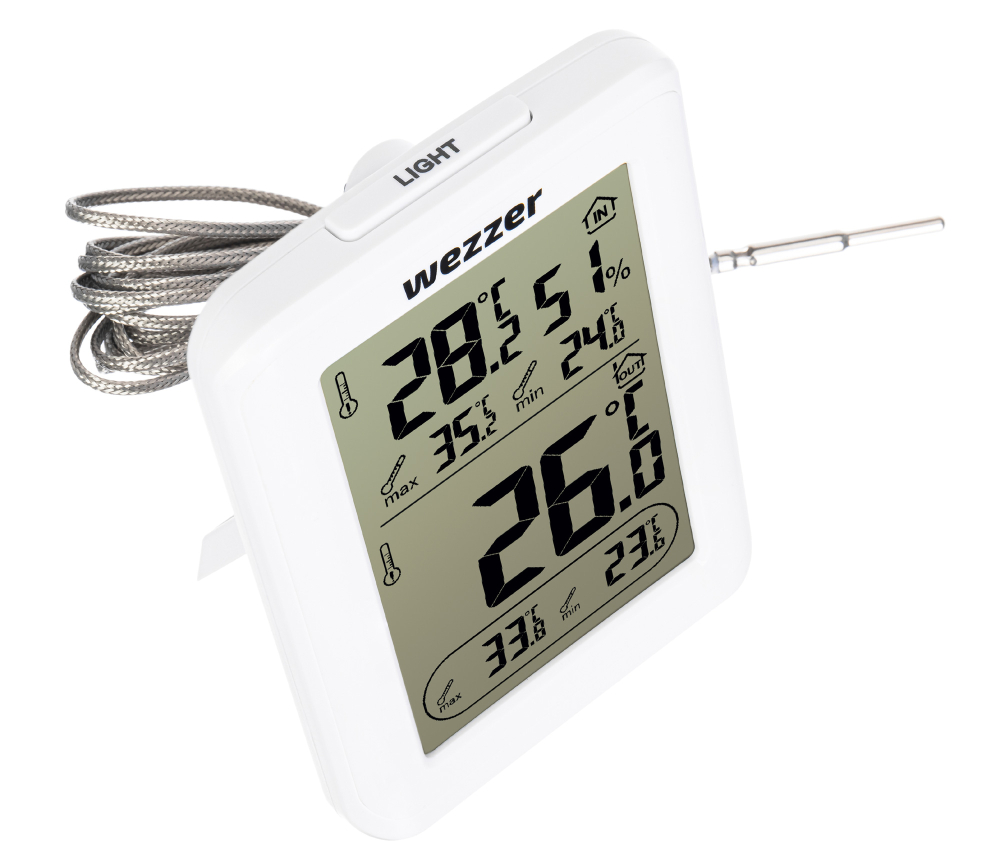 A kijelző tetején láthatók a fő egység értékei, alul pedig a hőszonda által mért értékek. Az aktuális hőmérséklet mellett mindkét egység megmutatja a minimális és maximális értékeket is. Ezenfelül a fő egység a levegő páratartalmát is méri.